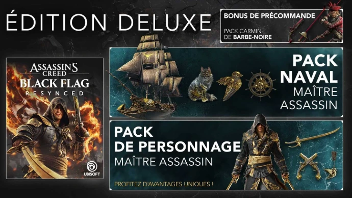 Par ailleurs, les joueurs qui précommanderont Assassin’s Creed Black Flag Resynced recevront le pack Carmin de Barbe-Noire comprenant une tenue exclusive pour Edward Kenway, une paire de sabres, ainsi qu’un ensemble de pistolets. Les éditions Standard, Deluxe et Collector ont également été annoncées.