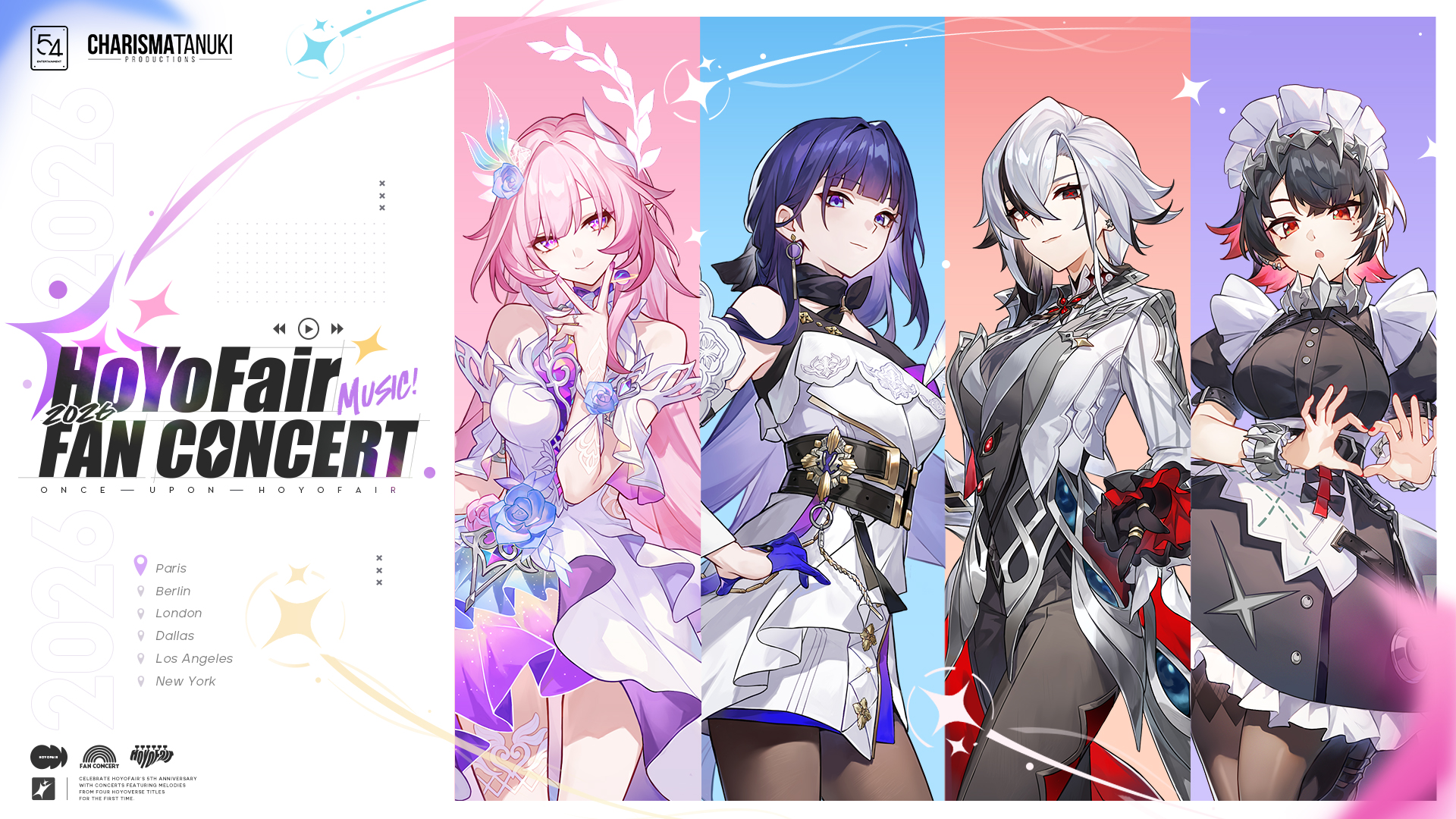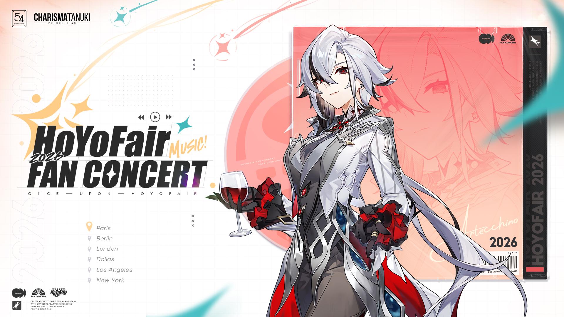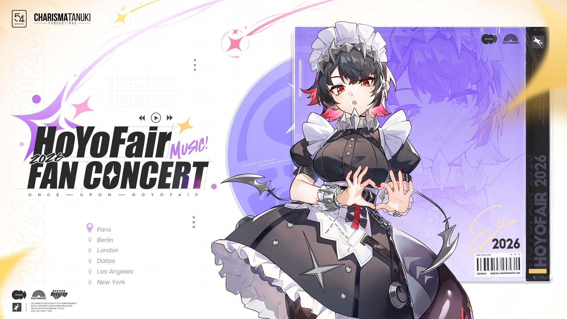 A l'occasion du 5e anniversaire de HoYoFair en 2026, le concert de fans HoYoFair sera présenté conjointement par 54 Entertainment et CHARISMA TANUKI PRODUCTIONS. Cet événement exceptionnel rassemblera des performances musicales remarquables à travers plusieurs jeux, dont Honkai : Star Rail, Genshin Impact, Zenless Zone Zero et Honkai Impact 3rd, offrant au public une expérience audiovisuelle immersive. Les sessions sont prévues pour le premier semestre 2026 en France, en Allemagne, au Royaume-Uni et aux États-Unis. L'ouverture officielle de la billetterie est fixée au 28 novembre 2025.