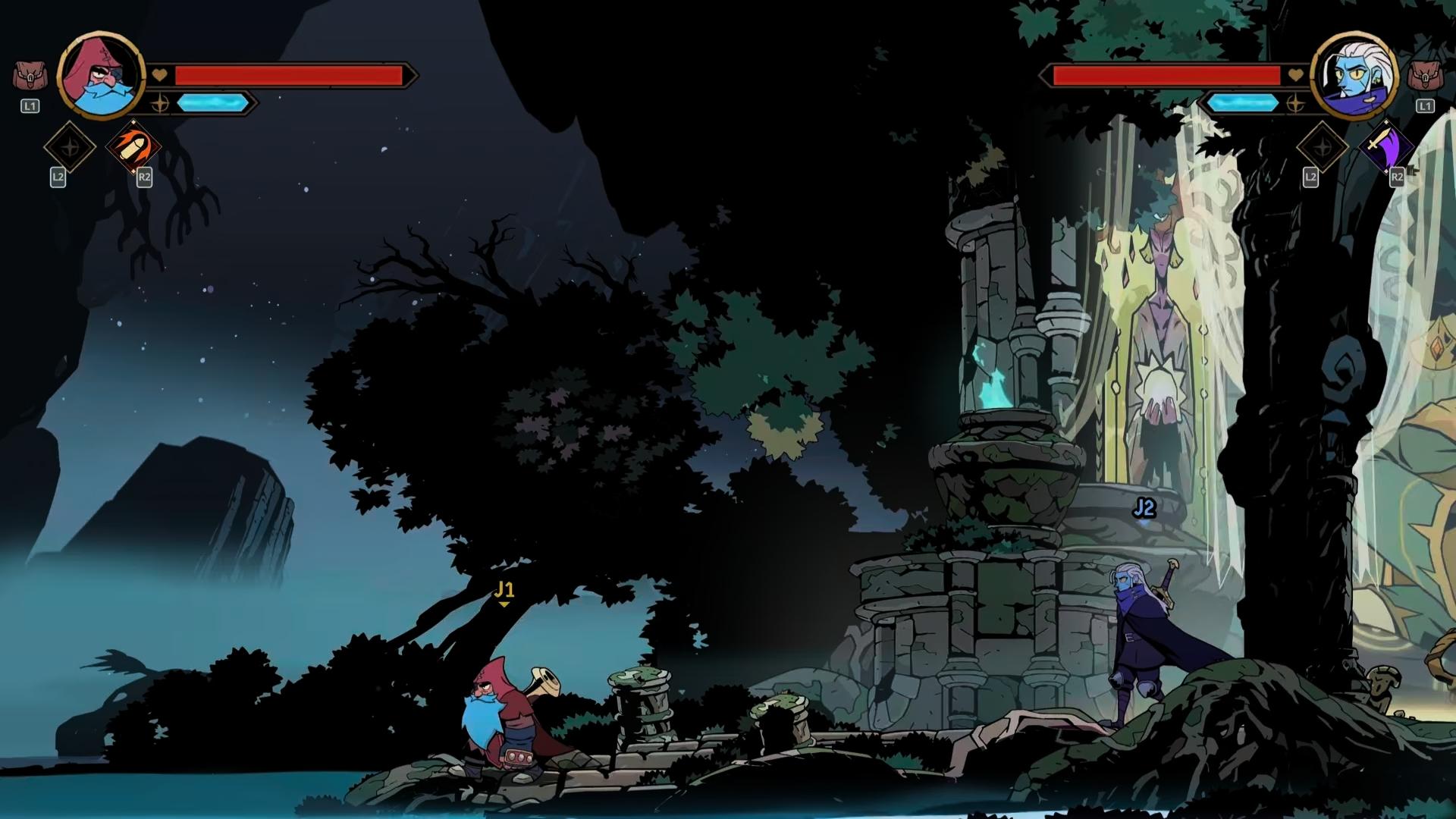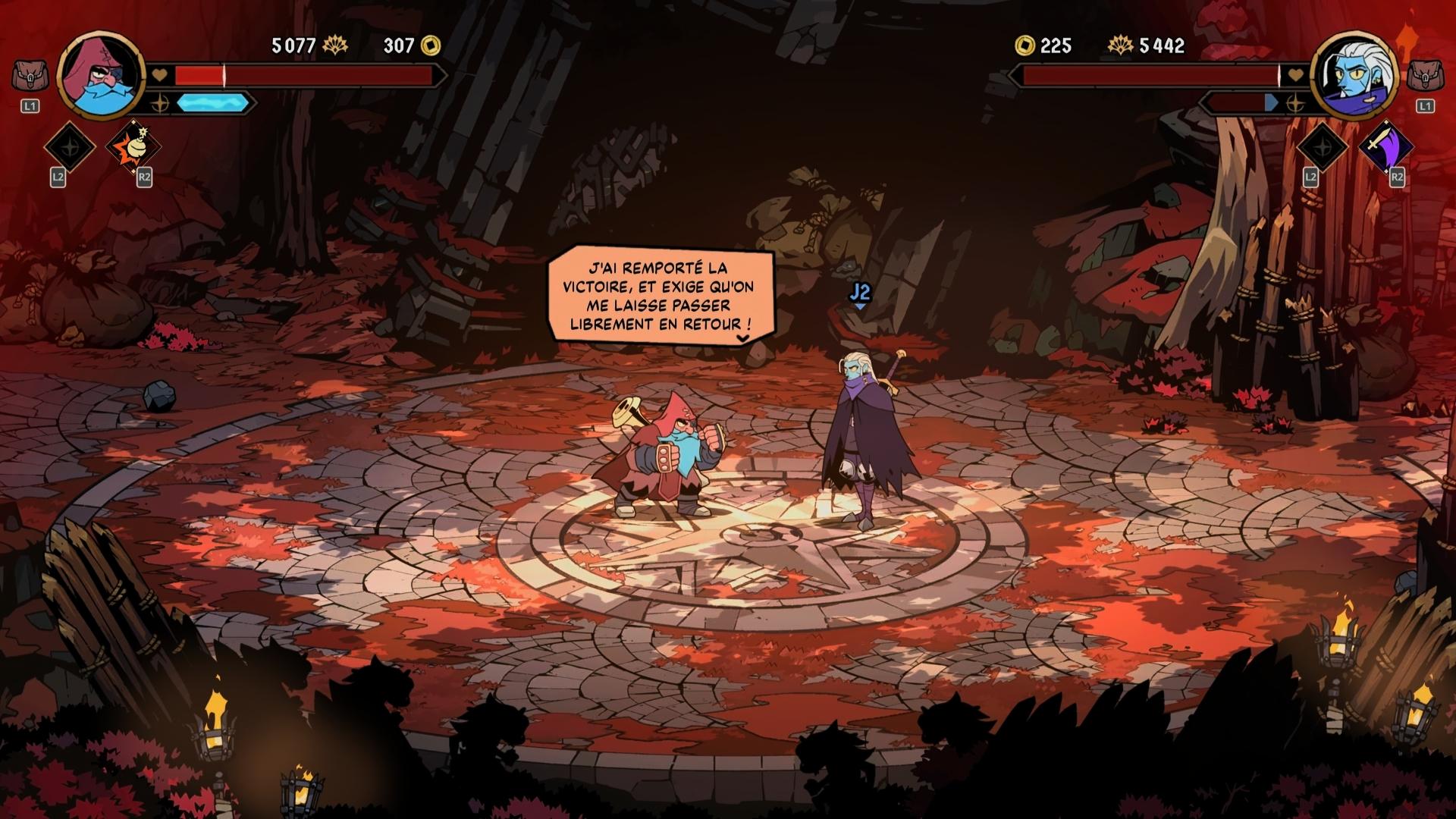 Au niveau du hub central, vous aurez les classiques. Un marchand pour acheter des nouvelles arcanes, un "arbre" des sœurs racines pour améliorer santé, argent et autres pour vos futures runs, bien évidemment il y a aussi une petite zone d'entraînement pour vous essayer aux techniques précédemment achetées et ainsi, pouvoir recommencer une run avec ce qui vous semble le meilleur pour votre manière de jouer. J'avais, personnellement, commencé nain avec Karl mais j'ai très vite adopté le coté voltige et pièges de Cider, plus léger plus rapide que Karl qui lui frappe plus fort mais de part sa taille a plus de difficulté pour les esquives.