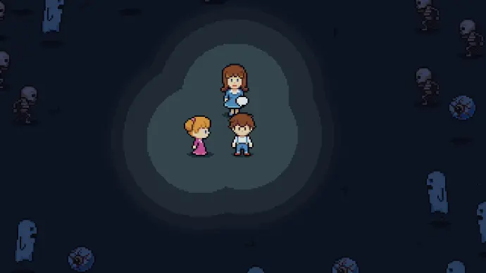 Après avoir rejoint Louise en face de la maison et avoir joué à la balle aux prisonniers avec des ballons à eau, dont la phase de jeu m’a beaucoup fait penser aux phases de combat de Undertale, Les frère et sœur rentrent à la maison et Théo est pris d’étranges visions. Ils se retrouvent tout à coup entouré de morts vivants et autres créatures cauchemardesques, pour un enfant.